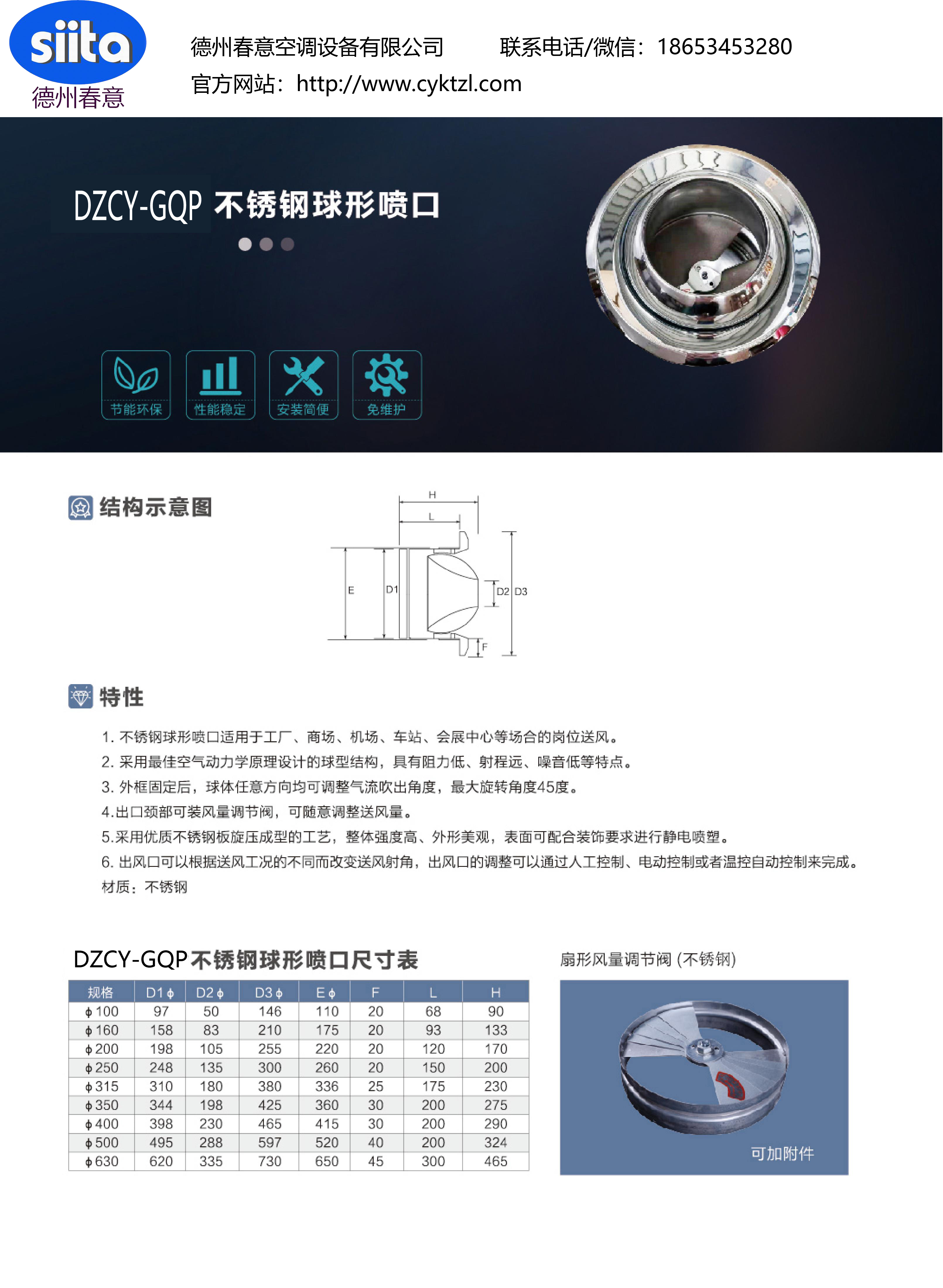 不銹鋼球形噴口是空調通風系統中的關鍵末端設備,憑借不銹鋼材質的特性與球形結構的靈活性,在氣流控制和環境適配性上具備顯著優勢。以下從用途、性能特點、適用場所三方面進行詳細解析:一、核心用途