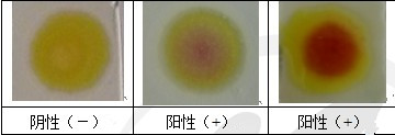 若點樣位置顯紫色、紫紅色、紅色、紅褐色,則可判定樣品中含有雙胍類物質即為陽性(+);若顯淡黃色、黃色則為陰性(-)。